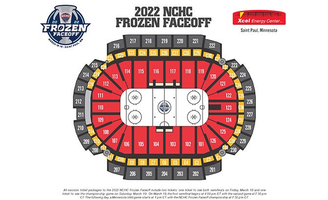 All-session and single day tickets to the 2022 NCHC Frozen Faceoff are on sale now. All-session ticket packages include two tickets: one ticket to see both semifinals on Friday, March 18 and one ticket to see the championship game on Saturday, March 19.